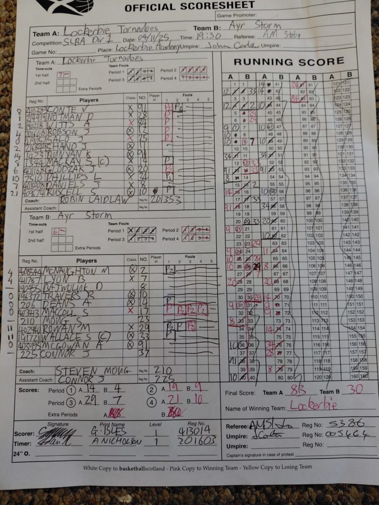 | Lockerbie Tornadoes 1 | 83 | 14 | 19 | 29 | 21 | 83 | Win |